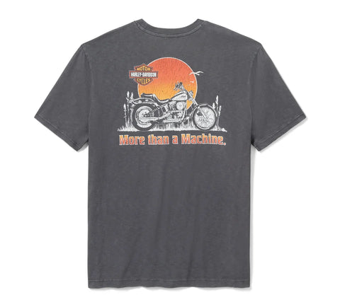 Lo stile vintage fa una deviazione negli anni '80 con la nostra maglietta Softail Sunset. Realizzata in morbidissimo jersey fiammato interamente in cotone, tinto e lavato vintage per un tocco rétro. Questa t-shirt da uomo presenta una grafica invecchiata del nostro FSXT Softail® del 1989 e lo slogan More than a machine, che divenne importante dopo il nostro buyback da AMF.