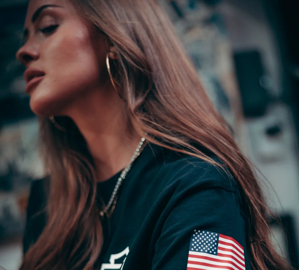 Stampa a mano morbida sul davanti, sul retro e sulle maniche. Etichetta principale stampata con marchi